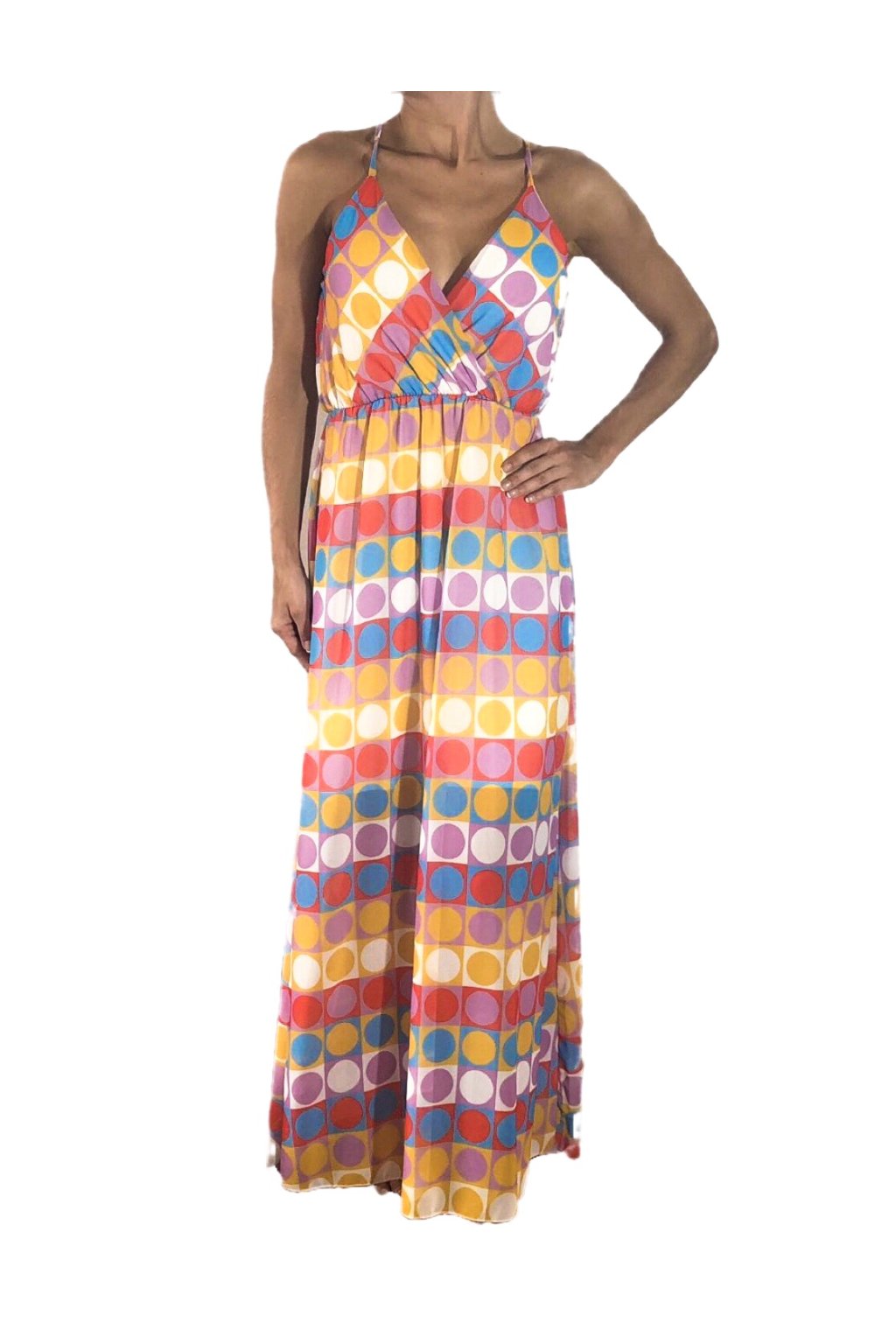 Vzdušné dlhé šaty na ramienka sú z príjemného a ľahkého materiálu, ktorý nebudete ani cítiť. Tieto šaty sú ideálne na teplé letné dni ale i na slávnostnú udalosť, sú perfektným kúskom v šatníku každej ženy. Šaty majú v páse všitú gumičku, vzor šiat tvoria krúžky hravých farieb. Vrchnú látku šiat tvorí šifónová tkanina, šaty sú podšité vzdušnou látkou a spodnička končí nad kolenami.