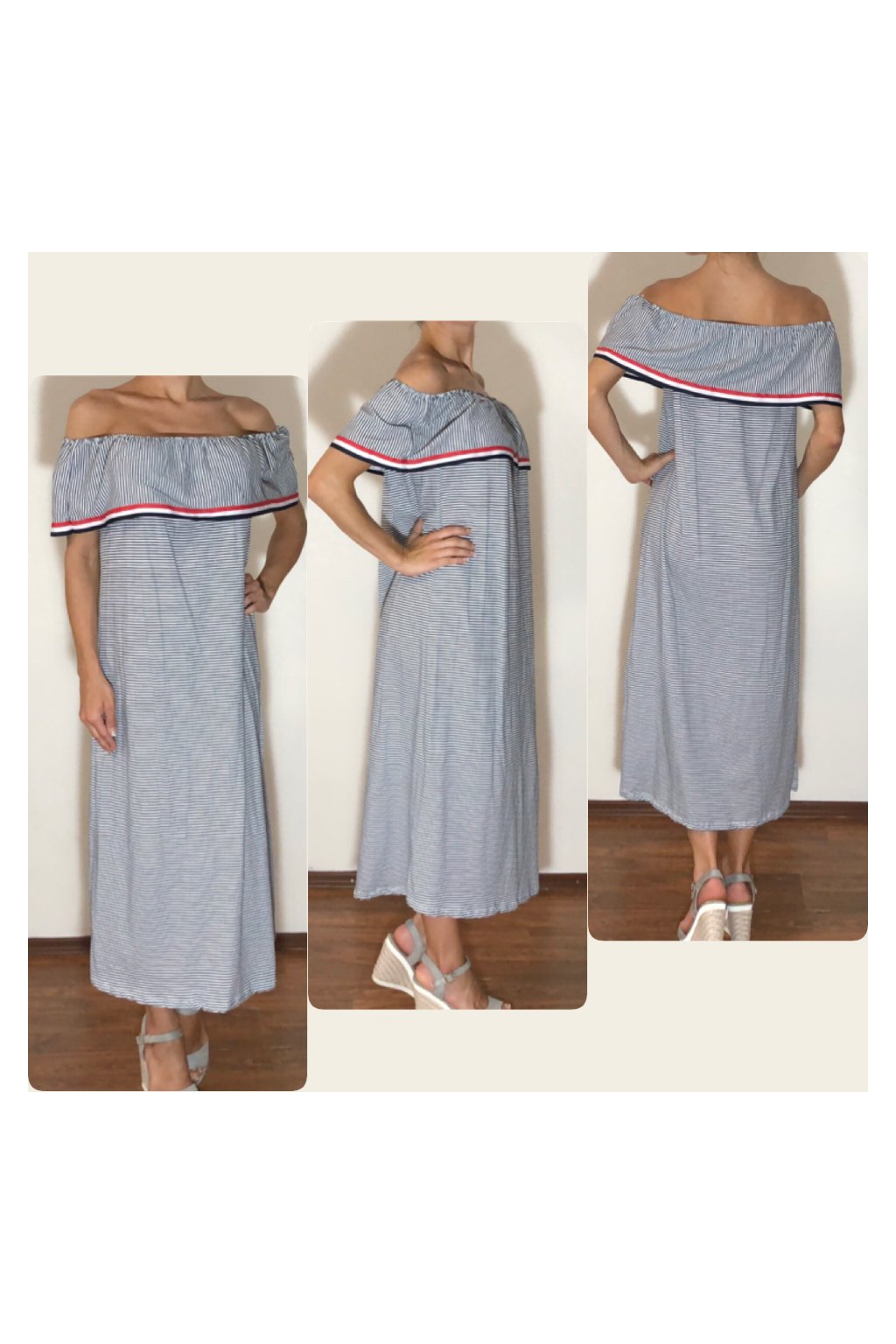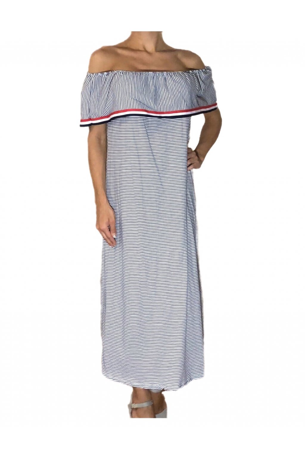Dlhé dámske šaty voľného strihu s volánom okolo ramien, sú ideálnym kúskom v šatníku pre letné dni. Šaty upútajú moderným námorníckym vzorom bielo-modrých vodorovných pásikov. Šaty je možné nosiť ako rozšírený model alebo ich vhodne doplniť rôznym typom opasku.