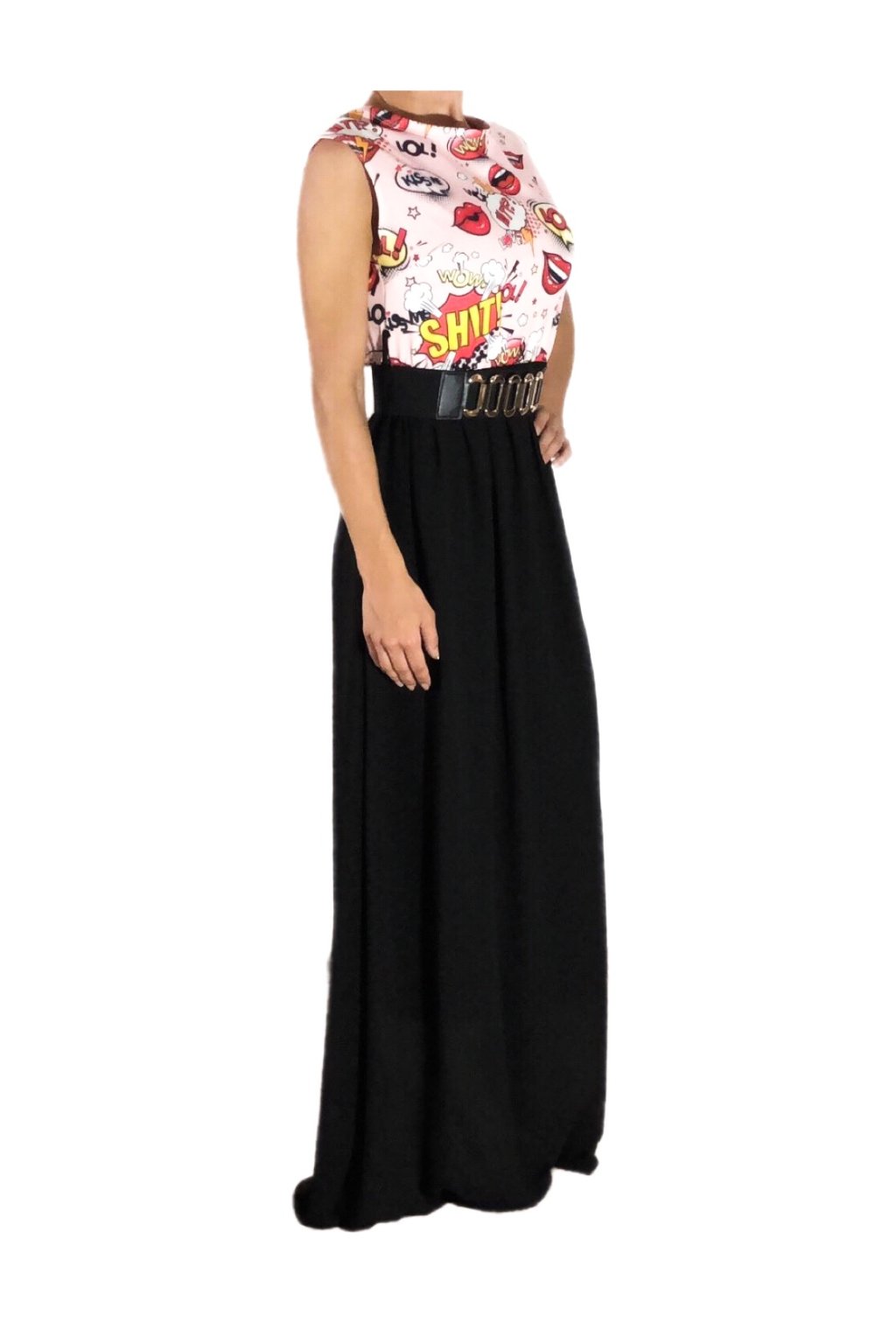 Úžasné dámske dlhé šaty, sú trendom tohto leta. Zaujmú najmä vrchnou časťou s komiksovou potlačou ale i krásnou dlhou šifónovou sukňou. Pod sukňou sa nachádza ľahká spodnička, ktorá siaha do trištvrťky dĺžky sukne. Top šiat je elastický, čiže pekne prilne k telu, šaty majú v páse všitú gumičku, pás lemuje odnímateľný strečový opasok, ktorý sa zapína na cvoky. V týchto trendy šatách skutočne upútate pozornosť.