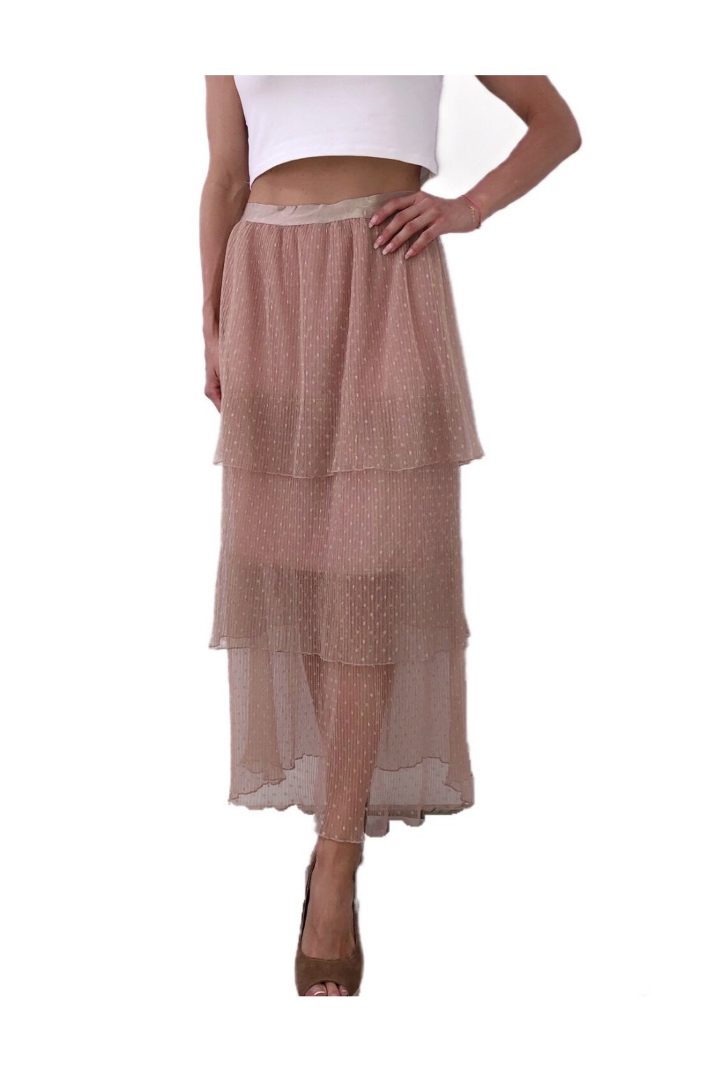 Dámska ľahučká sukňa so spodničkou krásne vytvaruje postavu a ukáže všetky prednosti. Sukňa je z jemnej tylovej látky, ktorá je kaskádovito nadpájaná a vytvára jemne nariasený dojem. Jemná ružovkastá farba s bodkovaným vzorom dotvára jedinečnosť jej vzhľadu. Materiál je príjemný a vzdušný a vďaka kvalitnej látke stále pekne drží svoj tvar.